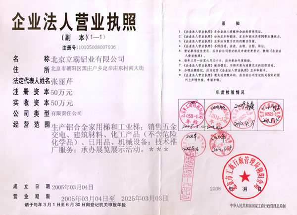 北京立霸鋁業有限公司是集研發、生產和銷售各種鋁合金工業型材、管材、板材、鋁合金梯子材料及梯子配件、鋁合金梯子、絕絕梯子、鋁合金液壓升降平臺等系列產品的專業廠家。